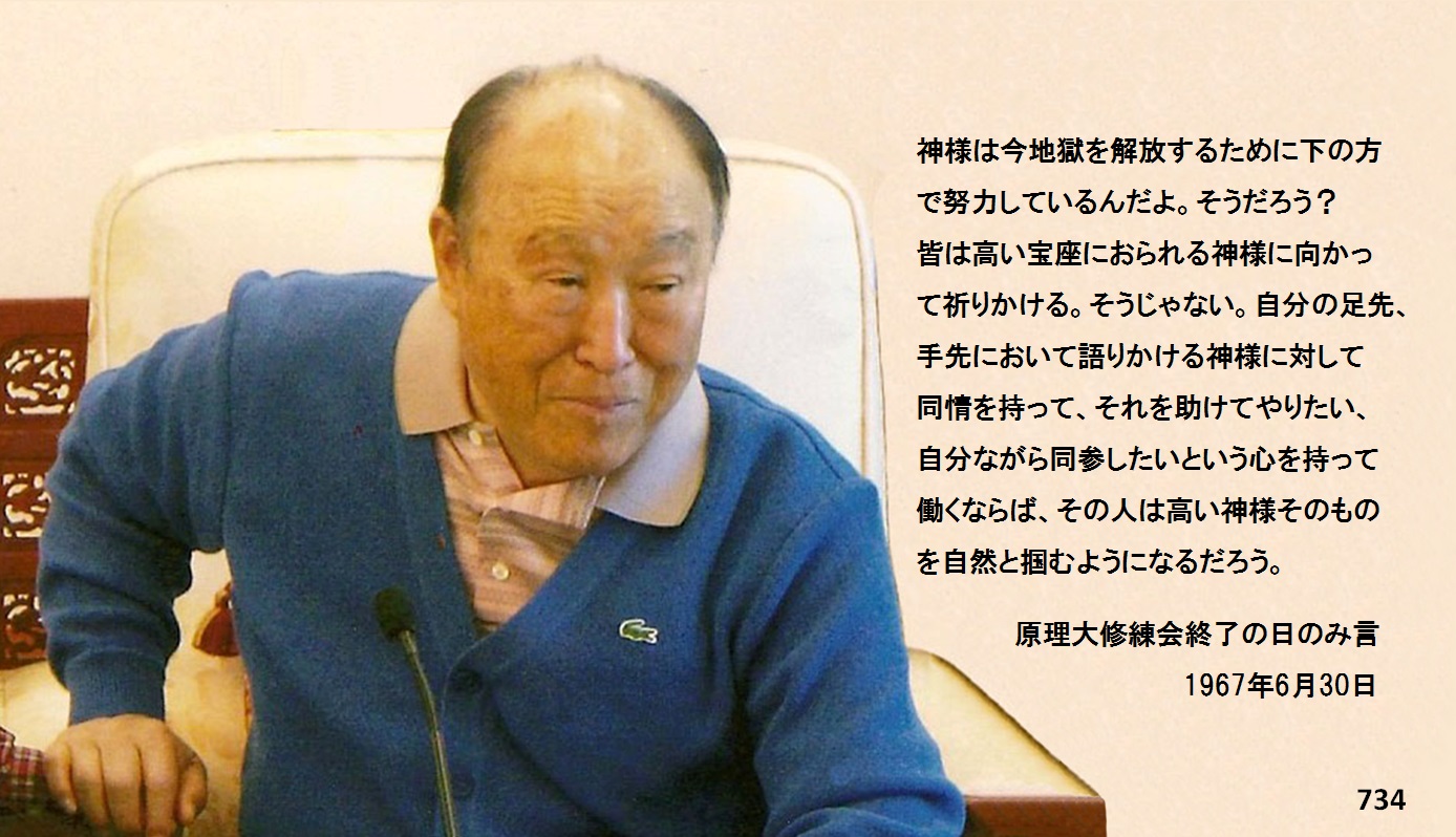 天にまします愛する父よ、つたなき我々をこのように集いながら、いかに御苦労なさったかということを我々は原理を通して学びました。こういうその中間の立場に立っておる我々人間としては、霊的すべての先祖たちの罪を贖い、そして現世においてのすべての地球に取り残されている万民のために救いの道をひらかなけりゃならない重大な中間位置にあるということを我々は切に思うものでございます。どうか我々内心的強固たる力を授けたまえ。そうして未来の希望を心に一杯抱き込んで神のために忠誠を尽くさなければ、住めないという確信を持って毎日の闘いにおきまして神にご奉公することができるような、そのような者となさしめて下ださることを切にお願い申し上げます。今日、捧げたる十四日間の大修練会をこの時間においてこれを最後として神の方に捧げます。どうかこの期間におきまして、いろいろな辛いこと、あるいは肉身におきましても辛いことがあったでありましょう。それにも拘らず、いろいろなその内的心情をその高めようとする原理的内容をその各自におきましても、いろいろなその故障があったということがわかります。これすべてのものは、神を愛せんがためのことでありましたから、これすべてのことを通して神の心情圏に立ち入れることができまするように神直接祝福して下ださらんことを切にお願い申し上げます。