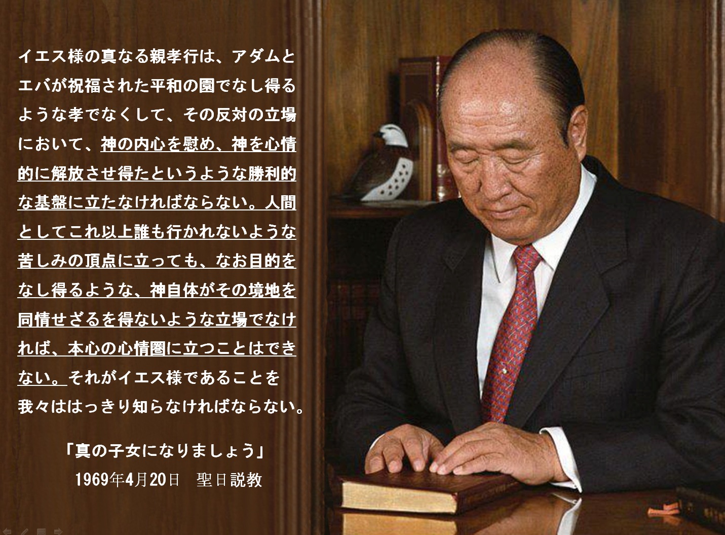 神が我々の真の親だとするならば神のふところに抱かれている子供のように、神が見ることができるような者になっているかどうかが問題である。だから聖書は教えている。「幼な子のようにならなければ天国に入ることはできない」。なぜ、そういうことを神は教えなければならないのかといえば、神はその本心において真なる子女を求めなければならないのである。神の内心においてそれを永遠に忘れることができない、愛さないではおられない。しかし、抱いて離すことができない幼な子のような子女を、神が永遠の愛を語りながら抱きあったことがあるか。それはなかった。そのような目的を願いつつ、日々を通過しながら、望みを抱きながら、エデンの園のアダムとエバを支えてきた神にとって、真なる目的達成の喜びと共にその子女を愛することができなかった。これを思う時に、復帰路程を通過して真なる子女となり得たいという立場に立っている我々は、エデンの園におけるアダム・エバよりももっと大なる目的完成を抱いて、神の愛の前に立つことを保障し得る子女とならなければならない。アダムより、エバより、もっと大なる使命を果たさなければ真の子女になり得ない。堕落した人間にとって、いかにしてその目的完成を体験するかということが問題である。