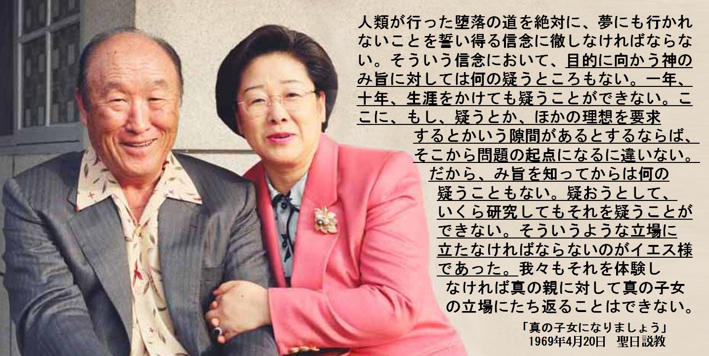 それを果たし得るのは平安なる道ではなく、戦いの真只中に立って生死の境目をのりきっていかなければならない。日本のために、世界のために、一死ばかりではなく、千死、万死を踏み越してもなさなければならない使命を感じる自分を発見しなければならない。自分ながら、そういう自分であることを認め、周囲の者も認め、全国が認め、堕落世界が認める基準を通過しなくては、真の子女という名前を付けて下さいと神に申し出ることはできない。だからイエス様以上に難しい立場に立っている自分達であり、イエス様以上の道を行く決意が必要である。そういう決意を持った者が日本に現われたならば、その人は問題になる。神はその人を愛さざるを得ない、その人に、アダム・エバに与えた祝福以上の祝福を与えざるを得ない。それ以上の目的完成のために神御自身援助せざるを得ない。問題はそこから始まる。先生がいつも思っているのはそういう基準である。世の中がどう見ようが、周囲の人が何と言おうが問題ではない。神に永遠に抱かれ得る子女の基準をいかに保ち得るか、それが問題である。自分の体面とか環境とかが問題ではない。その目的基準まで行って見てから、自分としてもう一度考えるべきであって、そこへ行かずして別の考えを持つことはできない心境に立たなければならない。これは自分一生の問題だけではなくして、歴史関係を持っており、過去の歴史だけではなくして、現世の世界が関係を持っており、現世ばかりではなくして、未来が連結されている。
