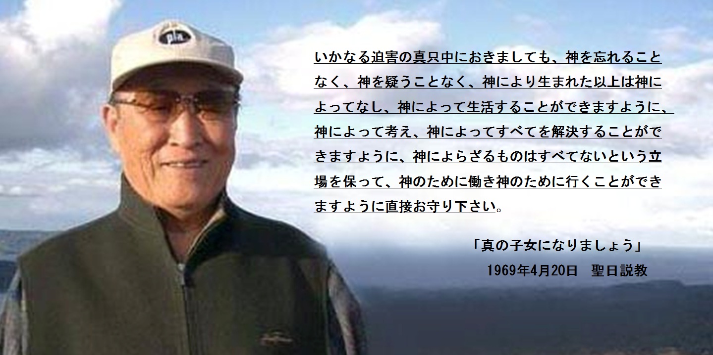 今に至った復帰の路程において、みじめな神様を我々はありありと実感することができますように導いて下さいますことを切にお願い申上げます。今まで苦しい道をたどって来た弱き者達が集まっておりますが、誰もが願わざる道をたどって行かれるその人の後を、ついて行く運命の境地を離れることはできません。涙ぐましい立場に立つ時、共にその境地に立たして下さいませ、迫害の真只中に立つ時も、又その者と共に働かねばなりません。復帰路程の運命のみじめさをよく知っております。この地上の一角に神の永遠なる足場となるその一平面の土地のないことを知っております。このような悲しみが地上にあらわれたのも我々先祖のあやまちであることを知っております。この道を何十倍、何百倍、何千倍蕩減してこれを果たさねばならない使命を弱き心情圏に神は背負わせ、辛い苦労の道を行けと命令せざるを得ないあなたの苦しみはいかばかりでしょう。神のその心情を察し得ることができますよう、毎日共にあり、共になし、共に我々を励まして、侍りゆくことができますよう、その境地を永遠に保つことができますよう祝福して下さいますように切にお願い申上げます。我々の願いは自分個人のための目的ではありません。神の名前と共に立ち、共にその目的をなし得る共同存在であるということを実感しなければなりません。いかなる迫害の真只中におきましても、神を忘れることなく、神を疑うことなく、神により生まれた以上は神によってなし、神によって生活することができますように、神によって考え、神によってすべてを解決することができますように、神によらざるものはべてないという立場を保って、神のために働き神のために行くことができますように直接お守り下さい。日本の一億国民を神の御前に復帰する数多くの苦難のいばらの道が横たわっていることは良く知っております。その知っている以上の決意が必要であります。今日の戦い明日の戦い、或いは一年、或いは生涯かけての戦いにおきまして、神に忠を残して行くにまちがいない者として育てて下さいますことを切にお願い申上げます。真の子女として立ち得る喜びの境地を万民と共にたたえる境地までなすことができますよう導いて下さい。勝利の圏界に立って神を直接たたえることができますよう守って下さいますことを切にお願い申上げます。今後のすべての時間あなたの主管圏にまかせますから、どうかみ旨のままに導きまして勝利の圏界まで、すべての喜びの基準としてたちかえることができますように祝福して下さることを切にお願い申上げます。真の父母のみ名を通してあなたの御前にお祈り申上げます。 (アーメン)