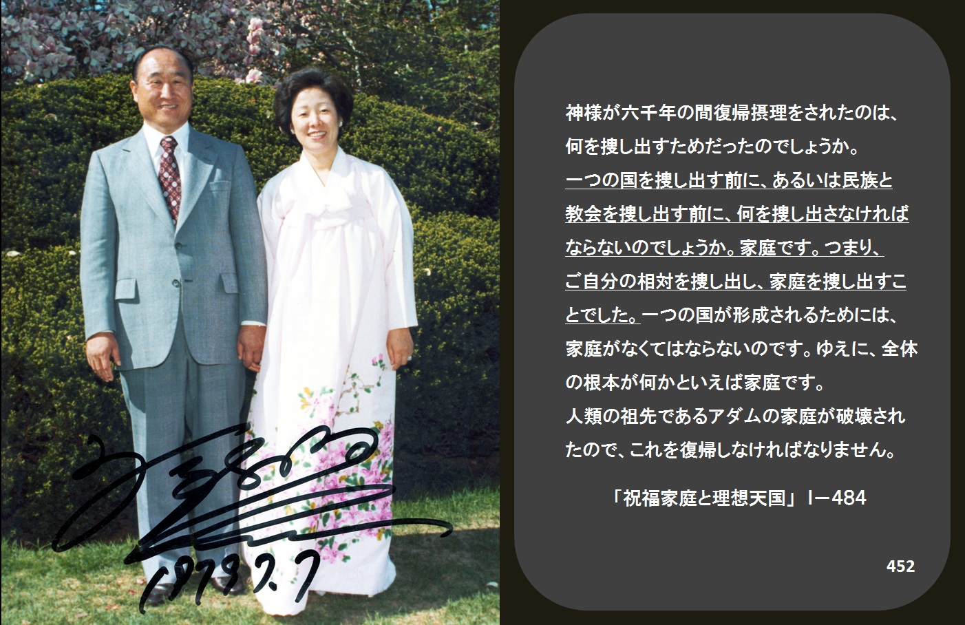 今日まで宗教団体、特にキリスト教が目標とし、信仰してきた個人の救いは、完成ではなく、第一段階の始まりにすぎない原初的な救いなのです。救いの目標は、家庭の救いを単位とするのですが、その家庭の救いの基盤というのは、世界を指導でき、世界の救いまで責任を負える家庭のことをいうのです。そのような心情圏が確立された家庭を築くことが、信仰生活の最高の理想にならなければなりません。(祝福家庭と理想天国I-四八四)
