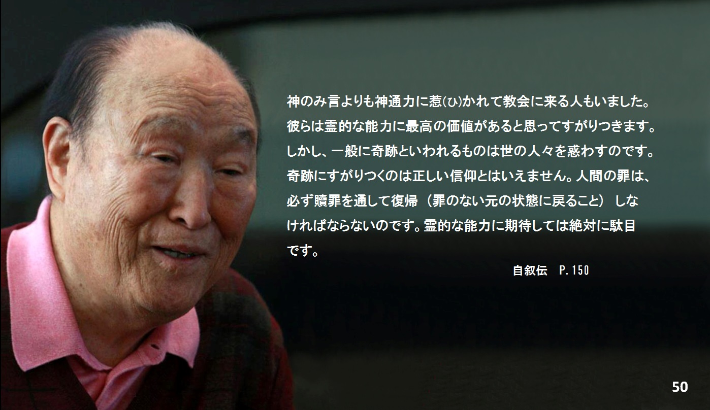 神のみ言よりも神通力に惹かれて教会に来る人もいました。彼らは霊的な能力に最高の価値があると思ってすがりつきます。しかし、一般に奇跡といわれるものは世の人々を惑わすのです。奇跡にすがりつくのは正しい信仰とはいえません。人間の罪は、必ず贖罪を通して復帰 (罪のない元の状態に戻ること) しなければならないのです。霊的な能力に期待しては絶対に駄目です。教会が定着してくると、私はそれ以上、心の眼で見たことを信徒に話さないようにしました。
