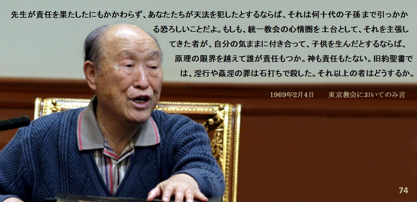 しかし、先生が責任を果たしたにもかかわらず、あなたたちが天法を犯したとするならば、それは何十代の子孫にまで引っかかる恐ろしいことだよ。もしも、統一教会の心情圏を土台として、それを主張してきた者が、自分の気ままに付き合って、子供を生んだとするならば、原理の限界を越えて誰が責任もつか。神も責任もたない。旧約聖書では、淫行や姦淫の罪は石打ちで殺した。それ以上の者はどうするか。